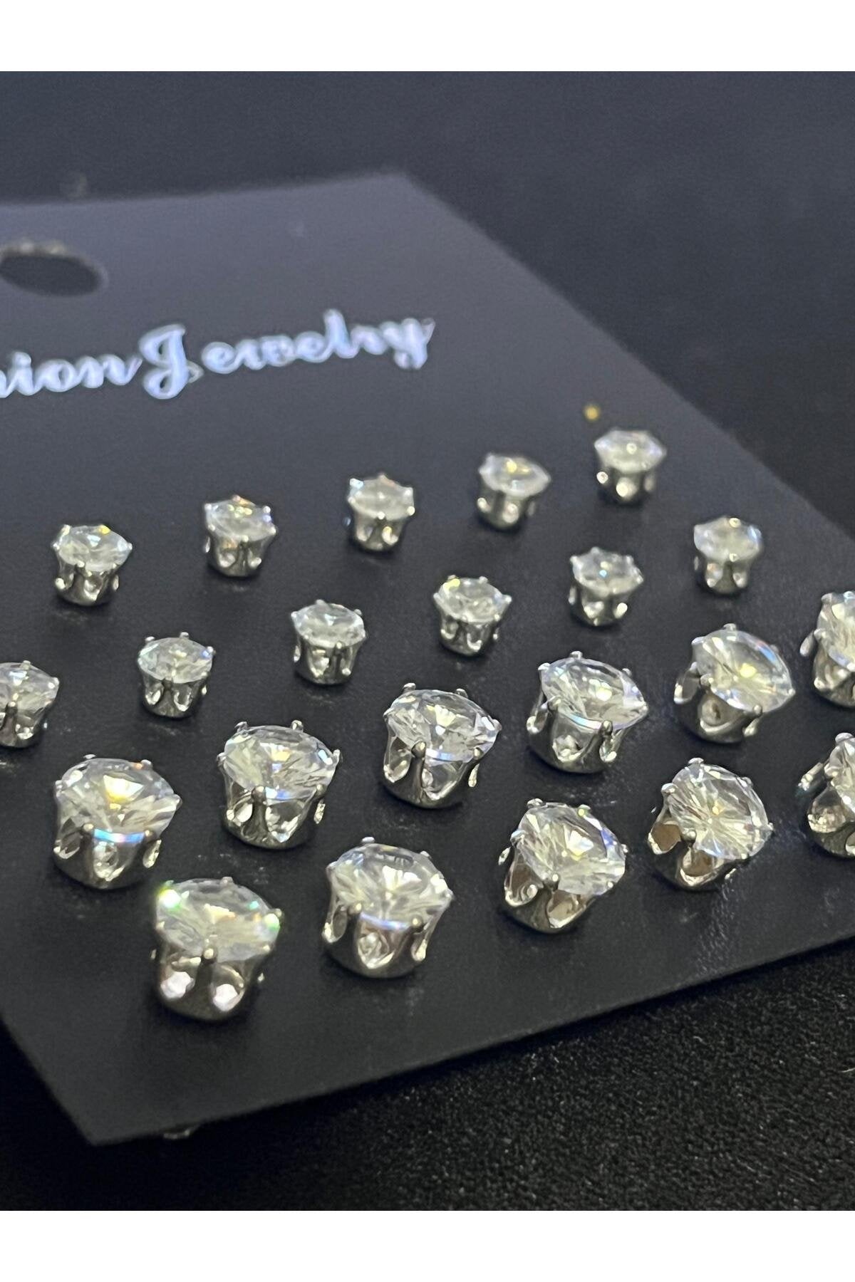 - 12 farklı boyutta gümüş taşlı küpe seti, her türlü kıyafetle uyum sağlayarak stilinizi tamamlar.; - Kadın ve kız kullanıcılar için özel olarak tasarlanmış bu set, zarif ve şık görünümünüzü ön plana çıkarır.; - Çivi modeli ile modern ve zamansız bir tasarıma sahip olan bu küpeler, günlük kullanım için idealdir.; - Zirkon taş kullanımı sayesinde gerçek elmasların parlaklığını yansıtarak göz alıcı bir etki yaratır.; - Cam materyali sayesinde hafiflik ve dayanıklılık sunarken, uzun süreli kullanımlarda bile formunu korur.